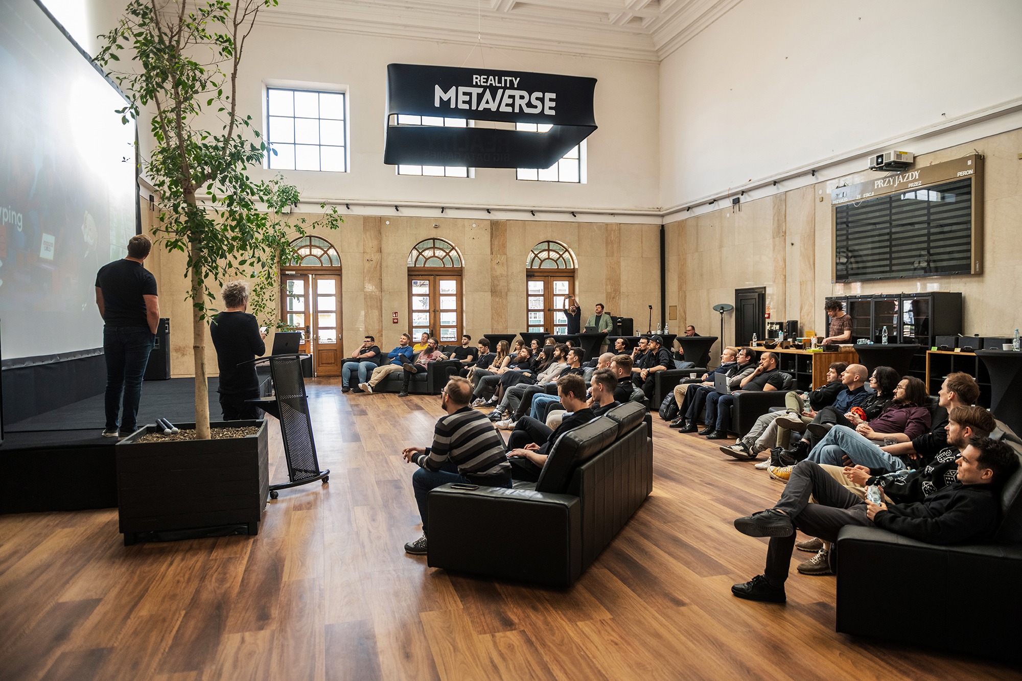 Stylowa przestrzeń z kanapami i stolikami barowymi, idealna do organizacji ekskluzywnych spotkań biznesowych i networkingu.